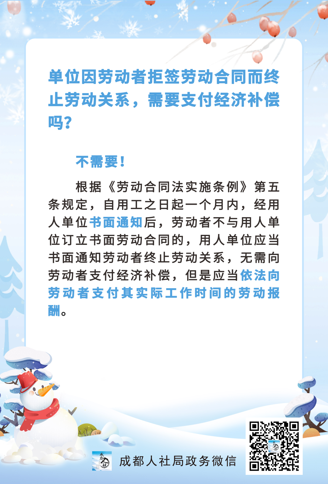 单位因劳动者拒签劳动合同而终止劳动关系,需要支付经济补偿吗?成都人社局答疑
