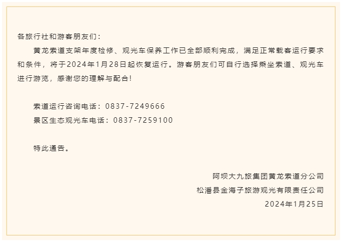 四川发布客户端消息 记者今日从“黄龙”微信公众号获悉,黄龙索道支架年度检修、观光车保养工作已全部顺利完成,满足正常载客运行要求和条件,将于2024年1月28日起恢复运行。游客朋友们可自行选择乘坐索道、观光车进行游览。