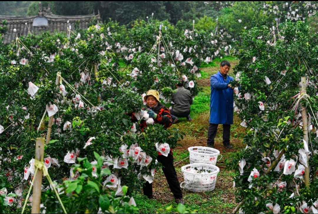 70%的丹棱人收入来自种植柑橘,图为丰收季,家家户户在果园采摘。何浩 | 摄