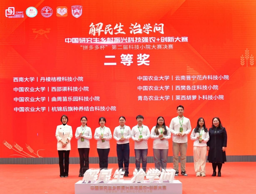 拼多多副总裁侯凯笛(左一)为包括丹棱桔橙科技小院在内的二等奖团队颁奖。赛事组委会供图