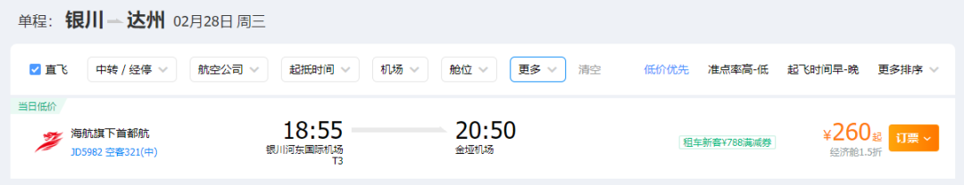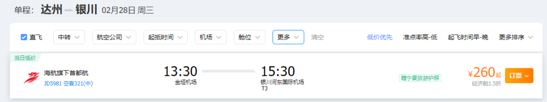 返程JD5982航班17:50从银川起飞,19:30抵达达州;20:20从达州起飞,22:55抵达三亚。