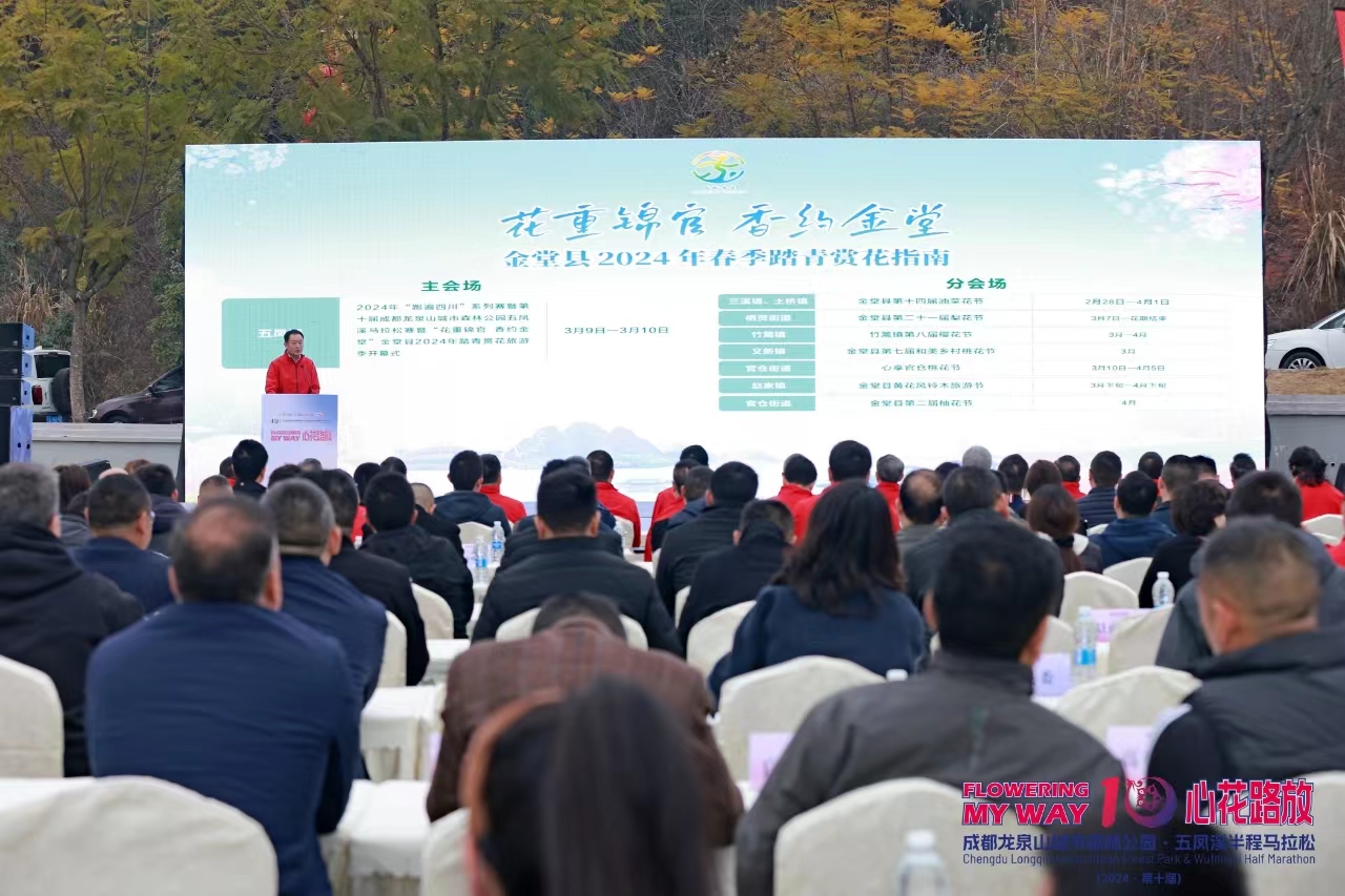 开幕式现场,成都市金堂县人民政府副县长唐毅发布了金堂县2024年春季踏青赏花地图,并进行了文旅投资环境推介。