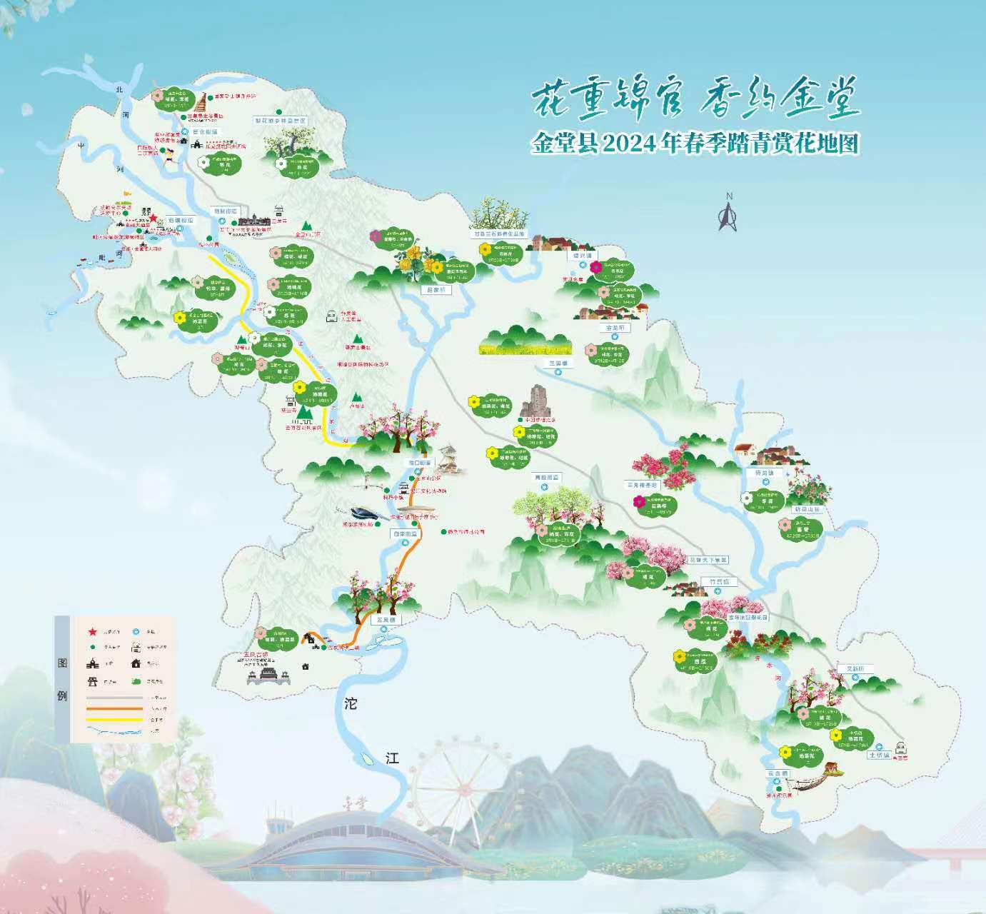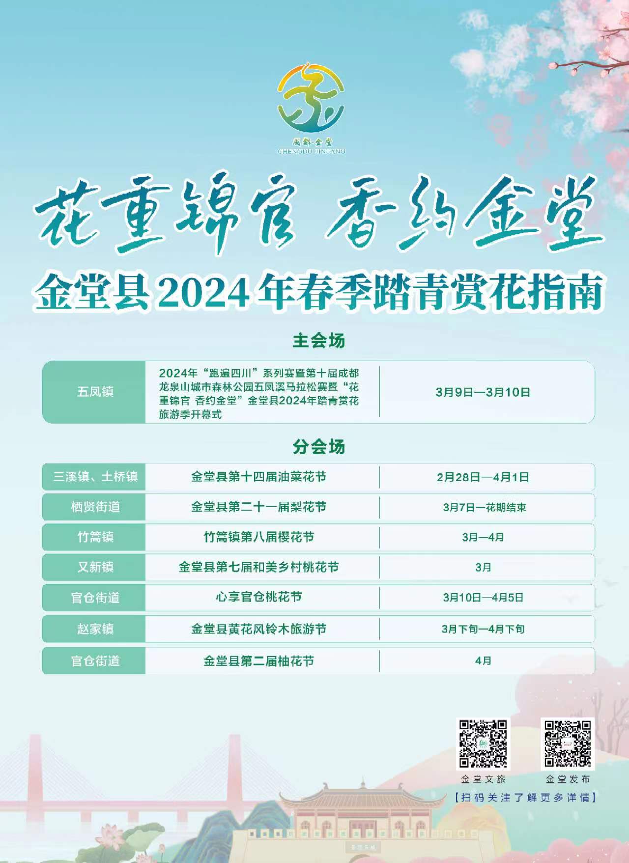 一图在手,金堂花海任赏游。2024年成都市金堂县春季踏青赏花地图为春日出行的游客们提供了贴心的指南,包括“2024“跑遍四川”系列赛金堂站暨第十届成都龙泉山城市森林公园•五凤溪马拉松”“金堂县第十四届油菜花节”“金堂县第二十一届梨花节”“竹篙镇第八届樱花节”“金堂县第七届和美乡村桃花节”“心享官仓桃花节”“金堂县黄花风铃木旅游节”“金堂县第二届柚花节”8场大型赏花活动信息,涵盖桃花、梨花、樱花、杏花、芍药花等近20种鲜花,共计30余个赏花点位,游客朋友可通过“金堂文旅”公众号获取地图信息。