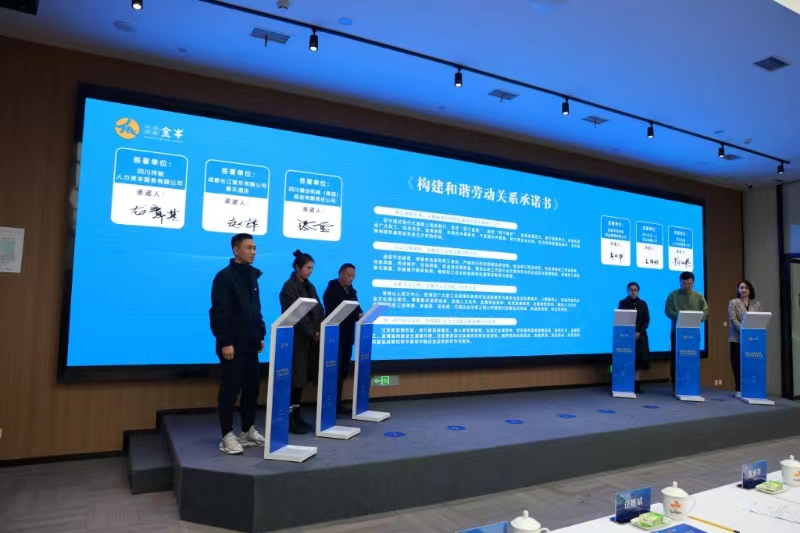 会议发布了成都市金牛区省级深化构建和谐劳动关系综合配套改革试点示范区建设方案。金牛区行政审批局、荷花池街道办事处等单位分别做了交流发言。四川建设机械(集团)股份有限责任公司等作为企业代表,现场签署《构建和谐劳动关系承诺书》。
