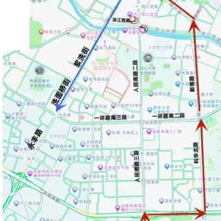 绕行线路1:从人民北路一段进城车辆,建议经人民北路一环路口(右转)→一环路五丁路口(左转)→沿五丁路→五丁路武都路口(左转)→武都路→人民中路三段路口(右转)进城