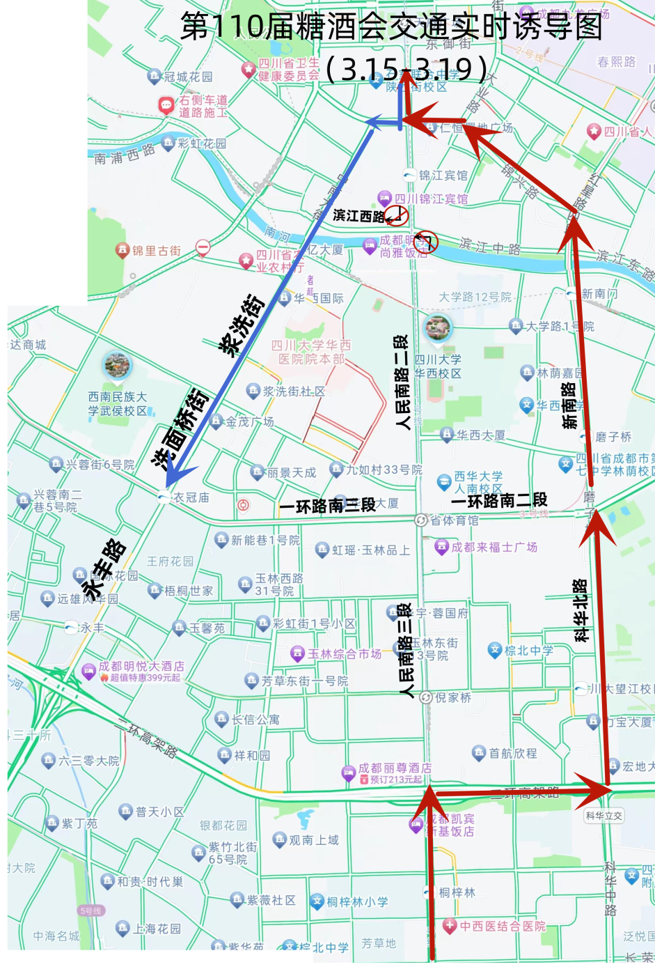 出行提示:请有计划前往糖酒会展位的市民时刻关注成都交警发布的最新交通临时管控路况信息,优先选择公共交通前往,听从现场交警、文明劝导员指挥有序通行。糖酒会期间客流、车流量增多,广大市民出行前请利用地图导航、交通广播等渠道,了解交通运行情况,提前做好出行规划。