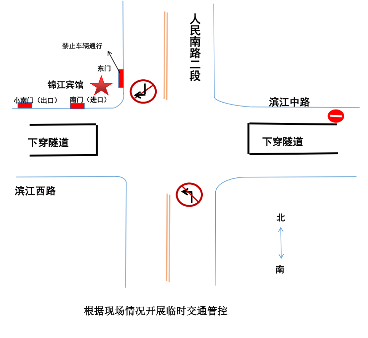 绕行线路3:从滨江中路进入人民南路车辆,建议从锦江下穿进入滨江西路→在桥北路口实施进出城转换