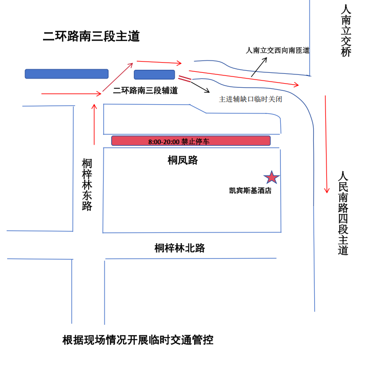 绕行线路4:从二环路南三段出城车辆,建议在人南立交西南侧辅进主入口进入主道→经西向南上行匝道→进入人民南四段出城