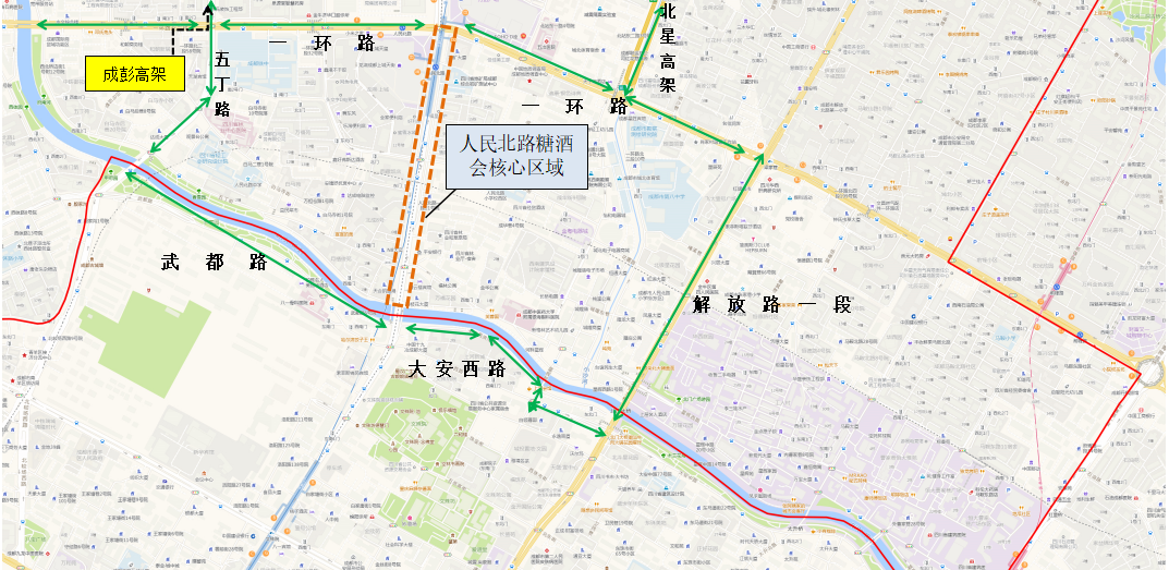 绕行线路2:从天府广场出城车辆,建议沿人民南路→红照壁路口(右转)→沿南大街至浆洗街出城