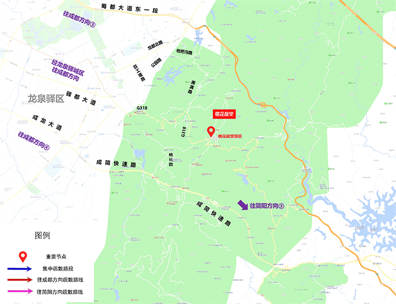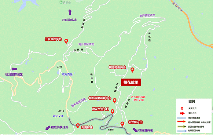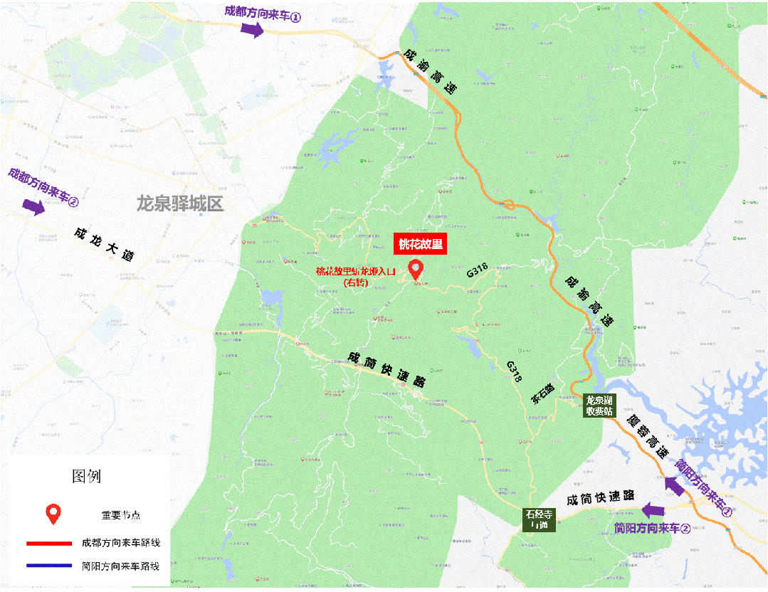 2.成龙大道→成简快速路→石经寺互通→318国道→桃花故里斩龙垭入口(右转)→桃花故里