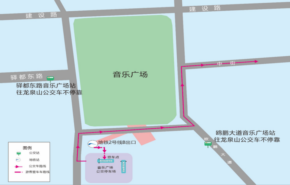 特别提示:桃花荟期间周末,沿318国道发往龙泉山景区方向的公交车将临时取消鸥鹏大道音乐广场站、驿都大道音乐广场站两个站点,沿318国道发往龙泉驿城区的公交车将临时取消318国道桃花故里站。