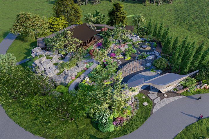 宁波园位于中华园艺展区第23号园,占地面积约1500平方米,整体地形东高西低,游览路线由低至高、由近及远根据高差及景观展开。