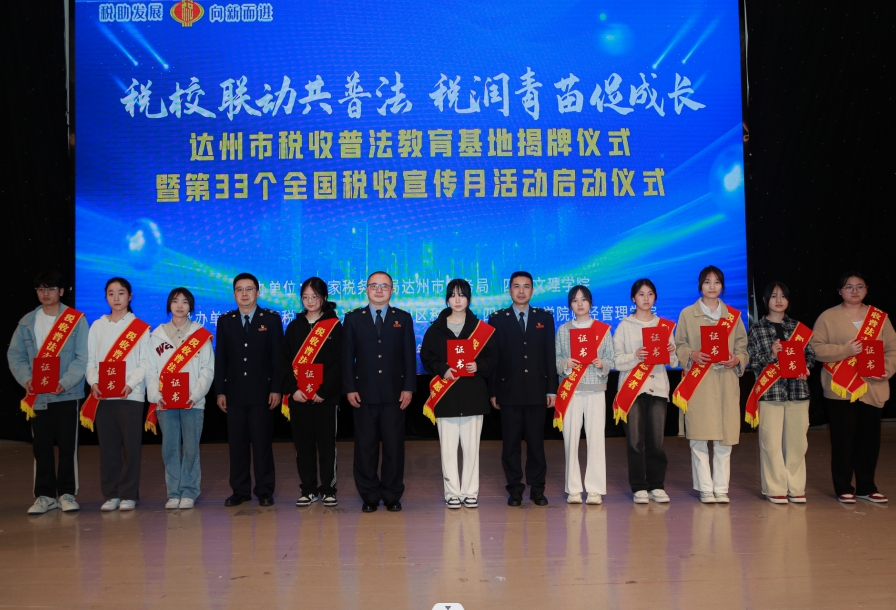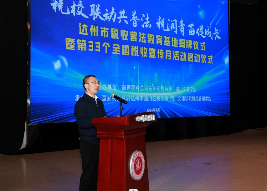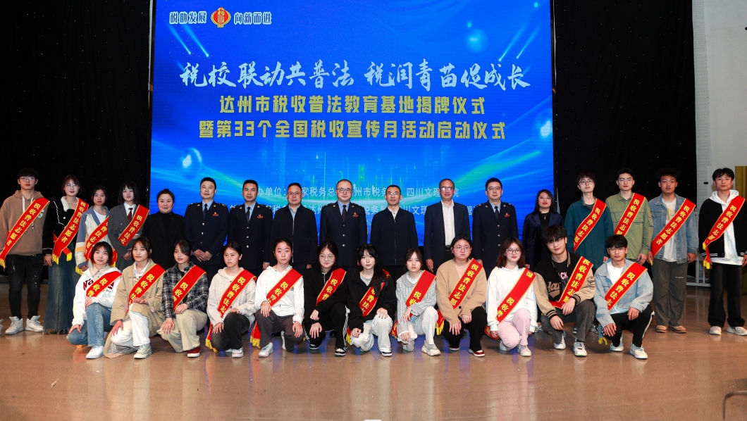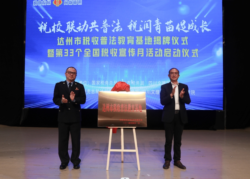 四川发布客户端消息 4月1日下午,国家税务总局达州市税务局、四川文理学院联合举办的第33个全国税收宣传月启动仪式暨达州市税收普法教育基地揭牌仪式在四川文理学院演艺大厅举行,正式拉开了“税助发展 向新而进”为主题的税收宣传月序幕。