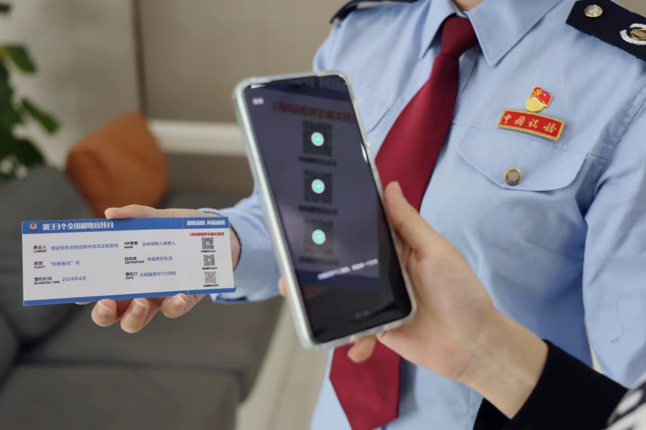 这是4月1日当天“蓉税双流”志愿服务队在成都双流国际机场向商家、过往旅客发放“稳经济 促发展 保民生 税收服务高质量发展”宣传资料,“没想到在机场还有税费政策宣传,登机牌的设置很有意思,这样的宣传也更能打动我们,税务部门的宣传搞得好。”王先生表示。