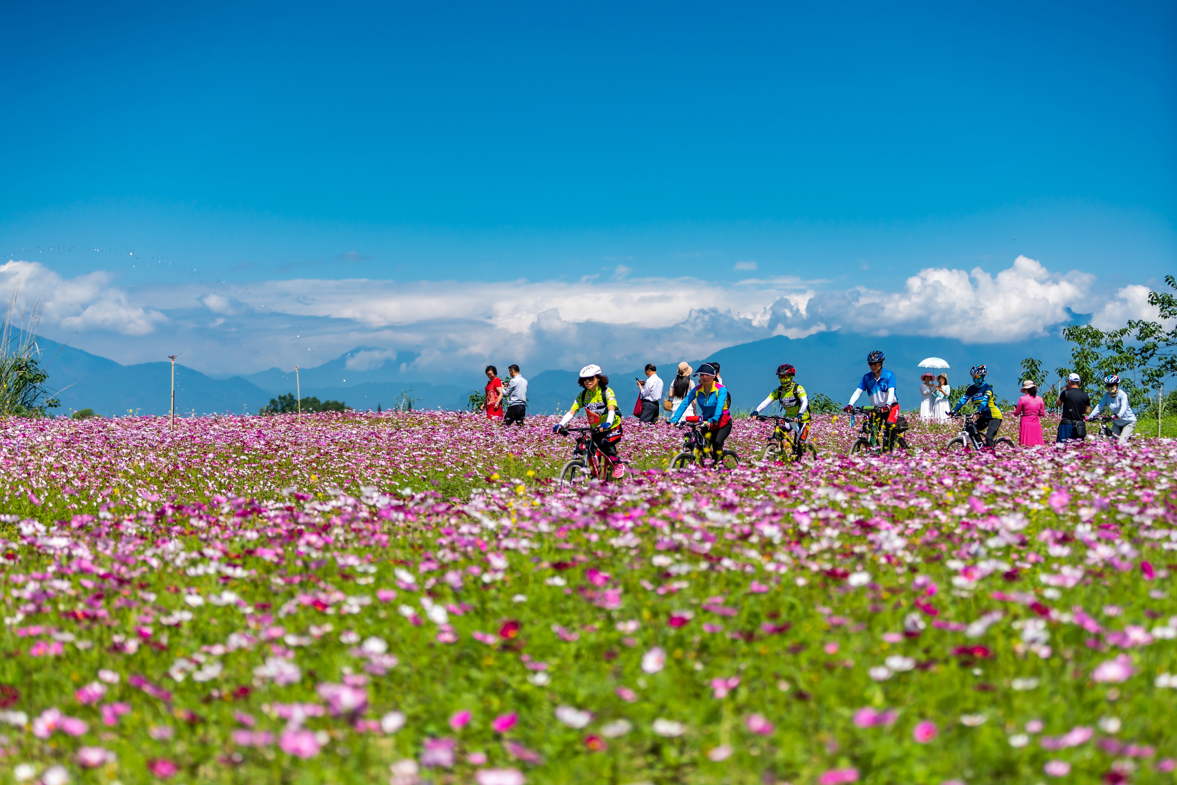 成都市积极推进农文旅融合发展,进一步整合农业和文旅资源,打造特色乡村旅游品牌,引导市民就近就地入乡旅行。图为居民在成都市温江区汪家湾格桑花绿道骑行游玩。 成都市发展改革委供图