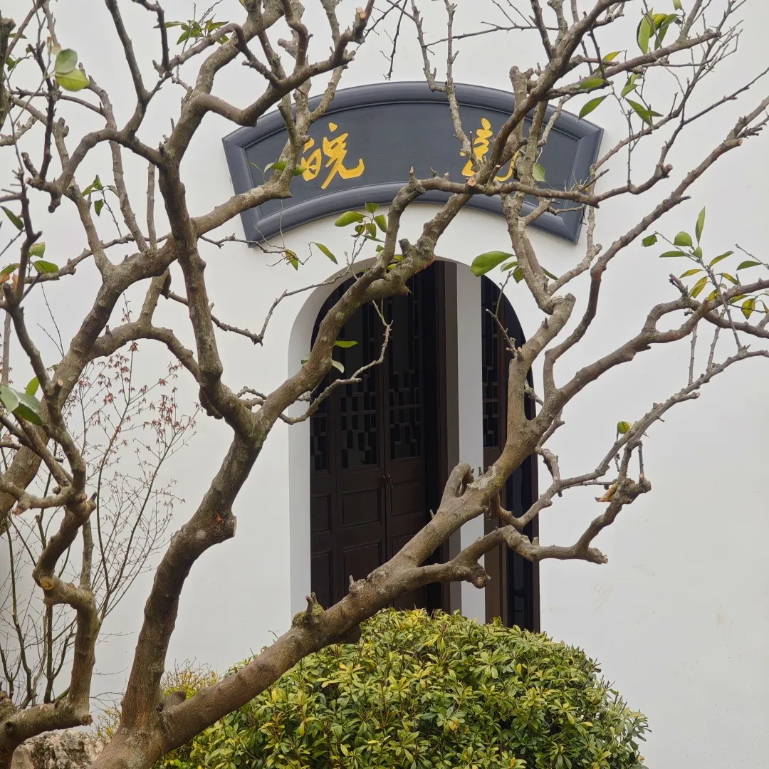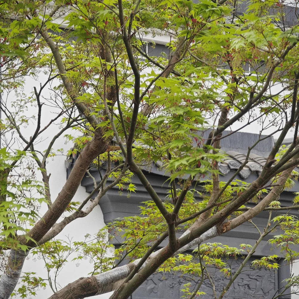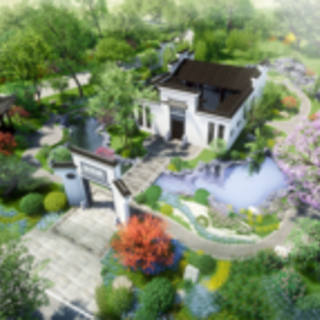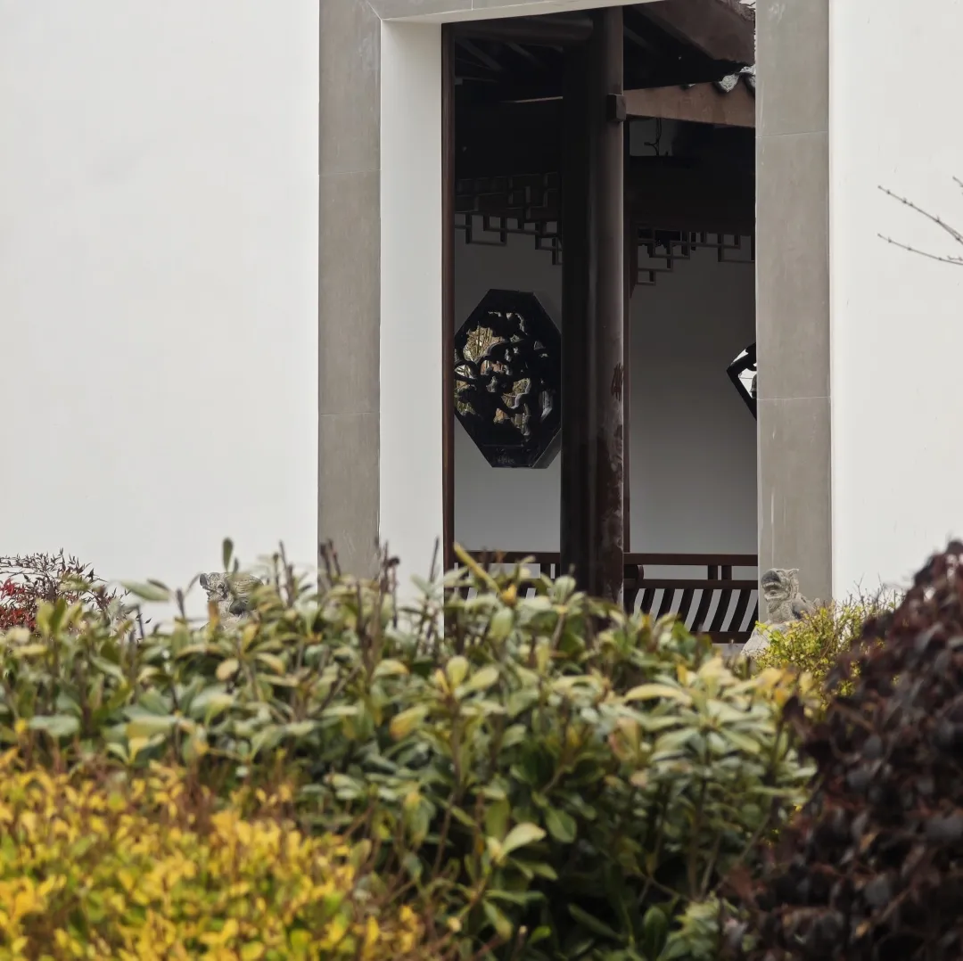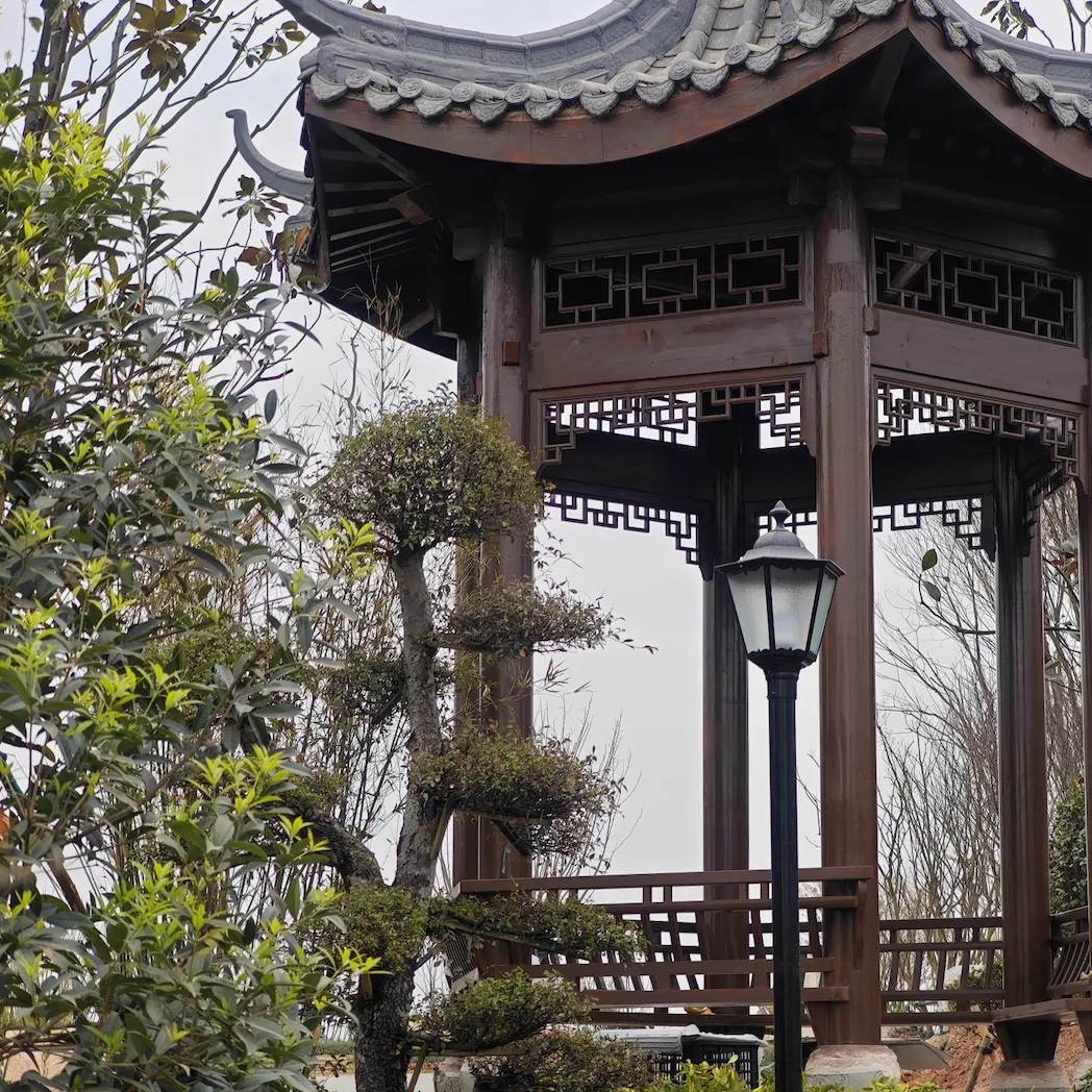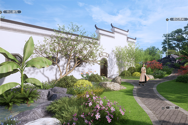 入园门坊整体形态取“八字门厅” 之形,呈现大门大户之气势感,取“ 宅门八字开, 人气滚滚来” 之意,造型上以徽派典型马头墙为主要元素。“四水归堂” 通过景观回廊、景墙、漏窗等园林手法,呈现“青砖小瓦马头墙、回廊挂落花格窗”的文化印象。“水圳汀步”以烟雨寻梦、松石探奇、花溪问趣等景点为主,通过湖石、水系、造型松等,打造“遇山”“穿水”“入林”的园林体验。