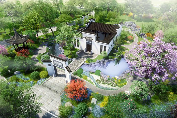 植物设计方面,“松石探奇”以造型黑松、慈孝竹、早园竹、金镶玉竹、凤尾竹为特色植物,象征徽商“贾儒并重”,谦虚诚信的良好品质;“花溪问趣”以合肥市花花石榴、成都市花木芙蓉为特色植物,结合穗花翠雀、森林鼠尾草、翠芦莉、柳叶马鞭草、千屈菜等蓝紫色多年生宿根地被,突出星际蓝主题色,开园期间营造鲜花烂漫的氛围,突出形象展示作用。“芳境寻幽”以梅花、桂花、腊梅等芳香植物结合芍药、桔梗、麦冬等药用地被,营造清雅解压的环境氛围,同时突出徽商早期经营药材以及安徽药用植物资源丰富的特点。(资料来源:成都世园会官网)