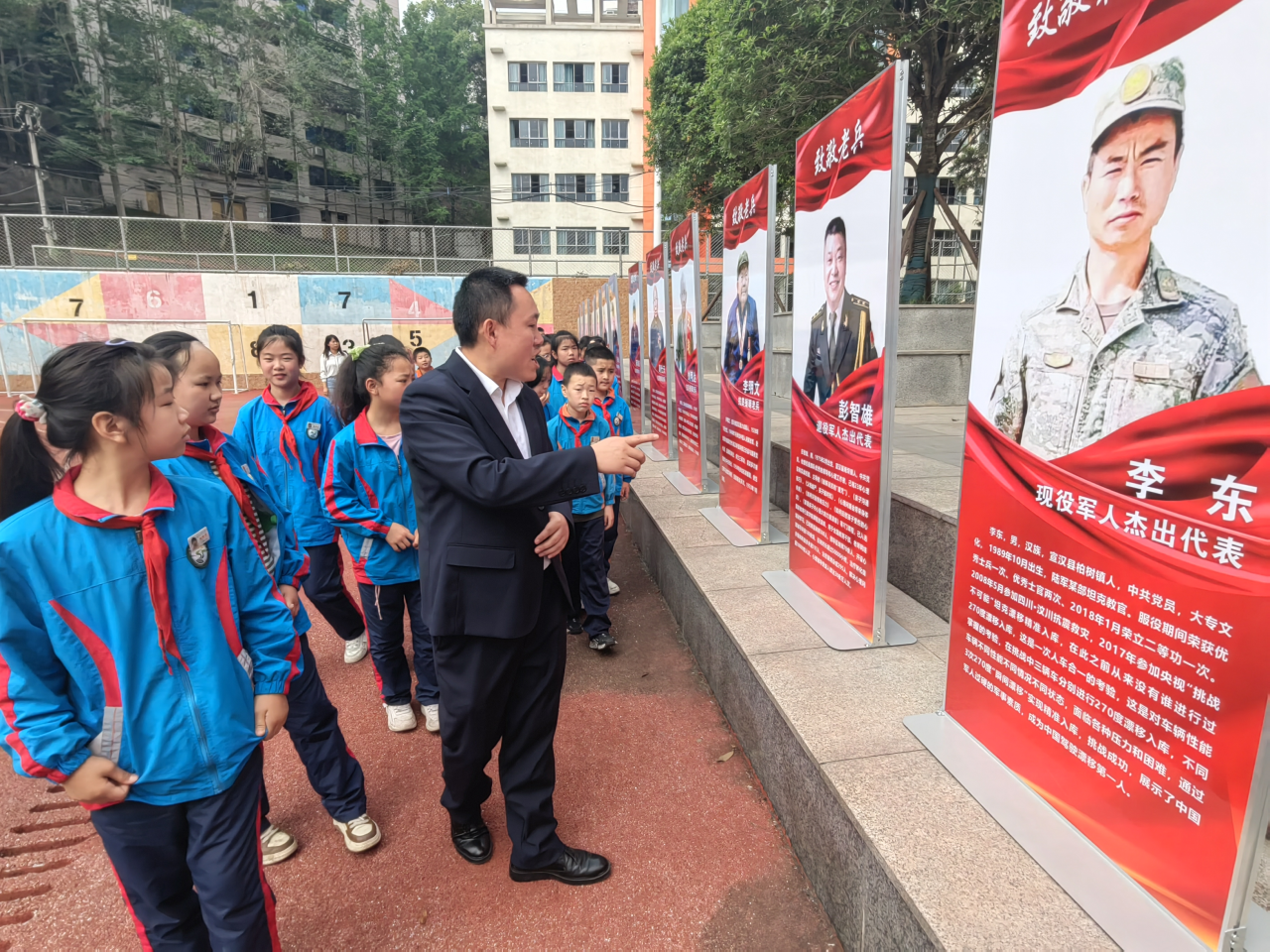 “李东,先后荣获优秀士兵1次,优秀士官2次,荣立二等功1次,2008年参加汶川抗震救灾,精湛的驾驶技术,过硬的军事素质,让他成为名副其实的‘兵王’。”在“致敬老兵”军人事迹图片展板前,讲解员逐一讲述40名老兵的先进事迹,让青少年学生深受触动,增强了他们对军人的了解,激发了爱国拥军热情。