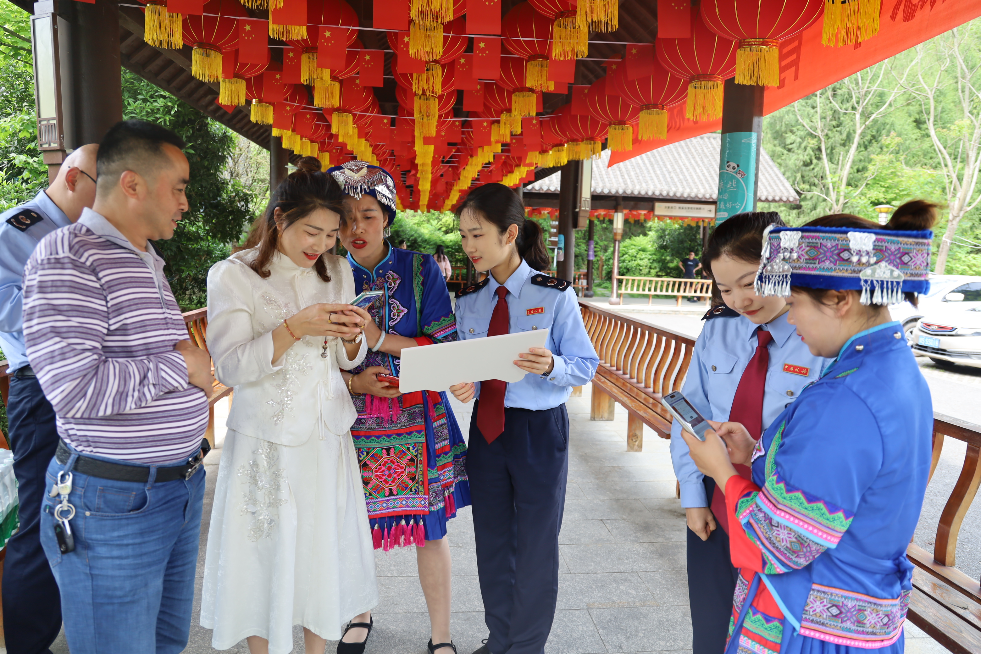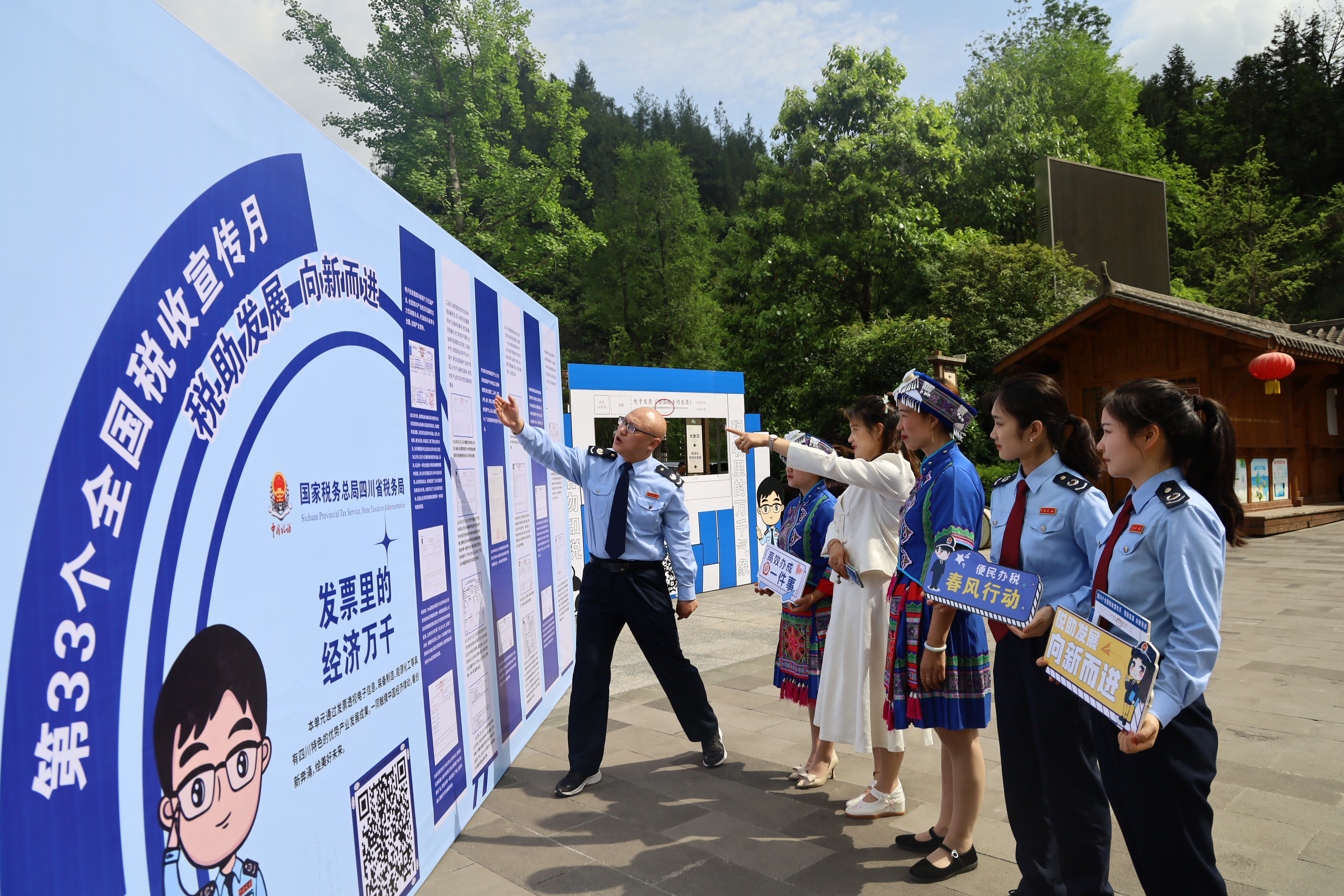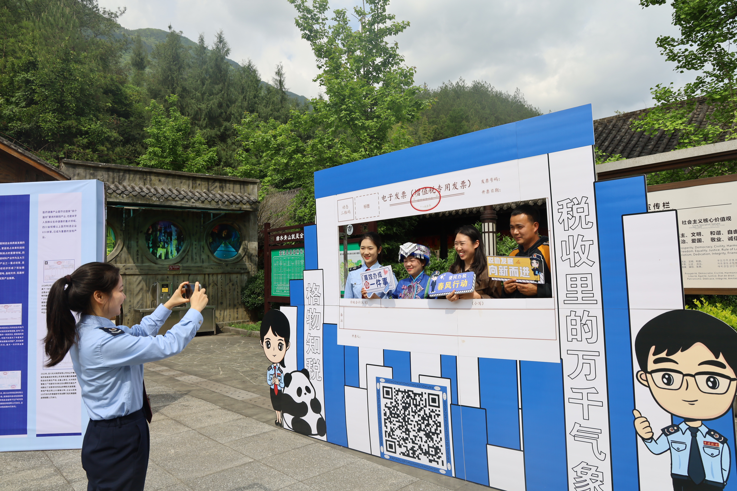 4月25日,“格物知税·税收里的万千气象”流动宣传主题打卡在巴山大峡谷大象洞风景区门口拉开序幕。宣汉县税务局乘着“便民办税春风”,围绕“税助发展 向新而进”主题,搭建税费政策咨询台,组织开展税收宣传活动,并设置“发票里的税收小知识”和“税收里的万千气象”两个主题单元,邀请游客与打卡区合影,参与抽取景区门票。活动以一张小小的发票为切入点,带领游客穿梭时空,一同重温发票的变迁史,感受“税”月流淌、经济腾飞,体会税收服务地方经济发展的成效。