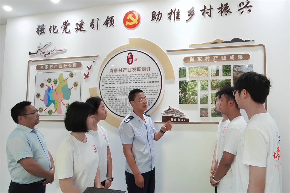 李晓峰为大学生普法志愿者讲解肖家村的产业分布情况和产业成果