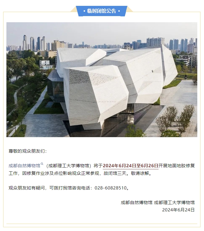 四川发布客户端消息 6月24日,成都自然博物馆(成都理工大学博物馆)发布公告,将于2024年6月24日至6月26日开展地面地胶修复工作,因修复作业涉及点位影响观众正常参观,故闭馆三天。