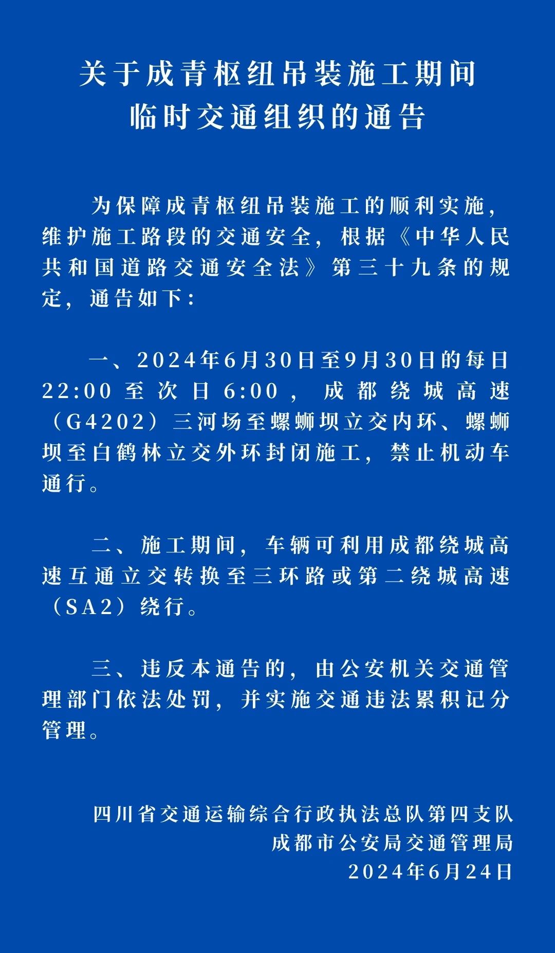 四川发布客户端消息 记者从“成都交警”微信公众号获悉,2024年6月30日至9月30日的每日22:00至次日6:00,成都绕城高速(G4202)三河场至螺蛳坝立交内环、螺蛳坝至白鹤林立交外环封闭施工,禁止机动车通行。