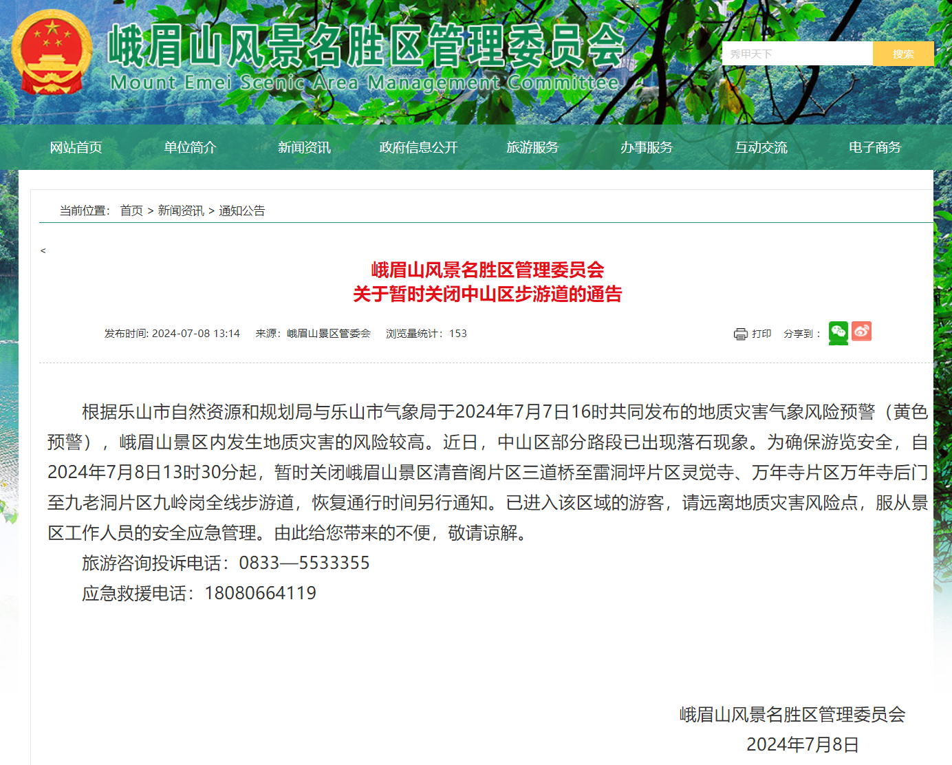 四川发布客户端消息 据峨眉山风景名胜区管理委员会消息,近日,中山区部分路段已出现落石现象。为确保游览安全,自2024年7月8日13时30分起,暂时关闭峨眉山景区清音阁片区三道桥至雷洞坪片区灵觉寺、万年寺片区万年寺后门至九老洞片区九岭岗全线步游道,恢复通行时间另行通知。