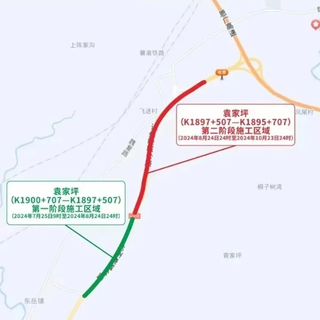 2.西侧道路封闭施工期间,东侧道路临时调整为双向通行,前往复兴镇方向车辆在袁家坪K1897+507处恢复西侧道路通行。