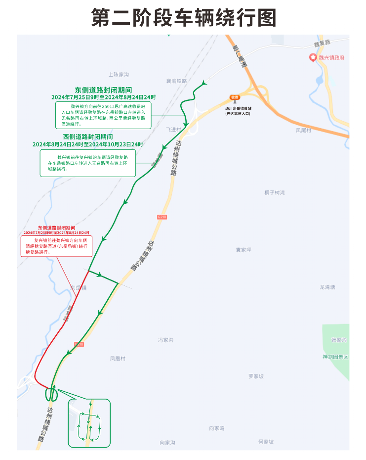 2.西侧道路封闭施工期间,东侧道路临时调整为双向通行。魏兴镇方向前往复兴镇方向车辆请经魏复路在东岳镇路口左转进入环城路绕行。