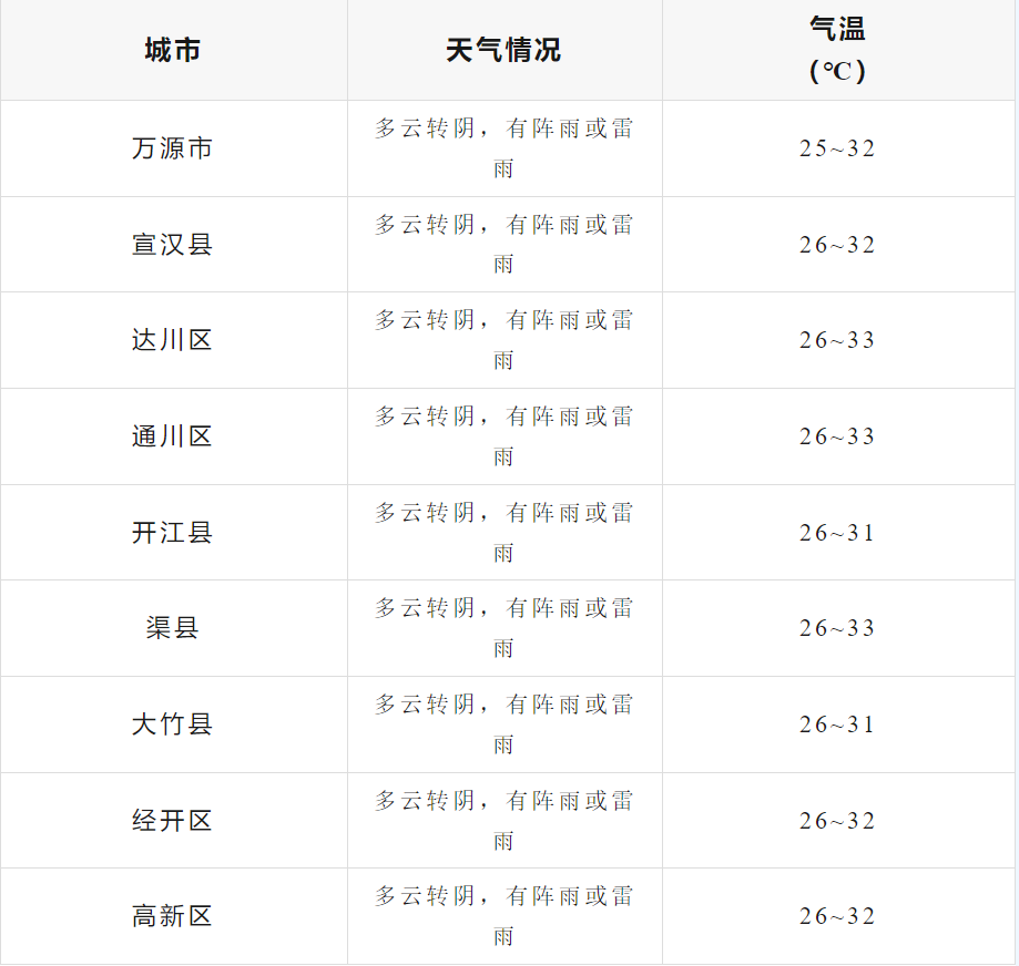 预计7月29日白天到晚上,达州市将出现一次强降水天气过程。开江、东部经开区、宣汉东部、达川区东部有大到暴雨(40~80毫米),局地大暴雨(100~120毫米),最大小时雨强30~50毫米;其余地方中到大雨(20~40毫米),局地暴雨。过程中伴有短时强降水、雷电大风等强对流天气。