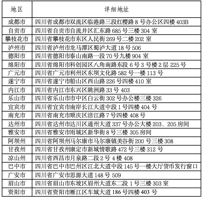 8月31日至9月2日为预约核实期。预约核实期内,未通过核查的公众可持预约登记使用的第二代居民身份证原件,前往预约登记的预约承办银行网点办理撤销违约记录及保留兑换资格业务。成功办理保留兑换资格的公众,可在兑换期内前往预约承办银行网点办理兑换;仅办理撤销违约记录,未办理保留兑换资格的公众,将不可办理兑换业务。公众如代他人办理撤销违约记录及保留兑换资格业务,须提供代办人和被代办人的第二代居民身份证原件。公众如对本人纪念币预约记录有异议,可在核实期内持本人第二代居民身份证原件,到中国人民银行四川省分行原营业管理部和人民银行四川省各市(州)分行查询。查询地址如下: