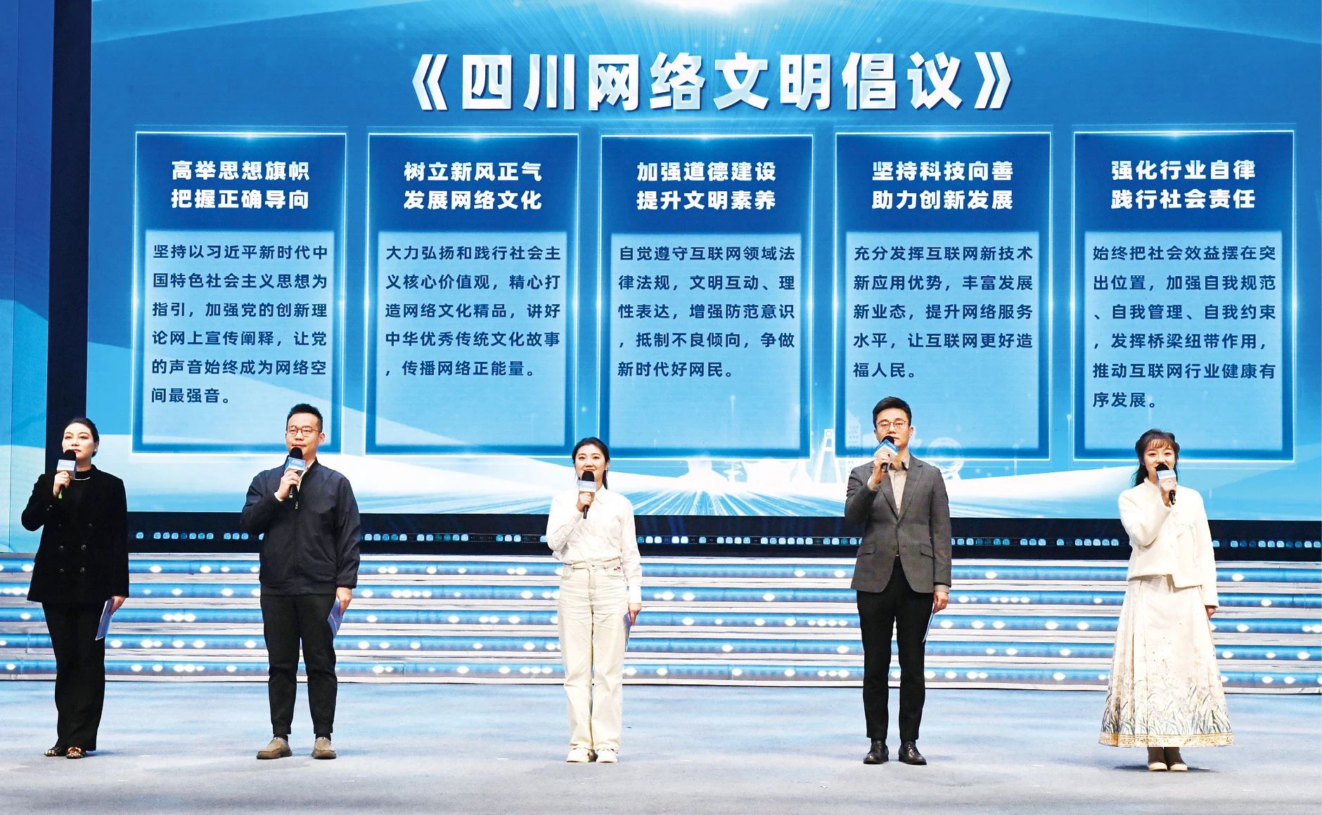 “以时代新风塑造和净化网络空间,共建网上美好精神家园。”2023年12月,在四川省网络文明建设暨走好网上群众路线活动上,来自互联网不同领域的5名代表共同宣读了《四川网络文明倡议》。倡议背后,是四川扎实推进网络文明建设的生动实践。