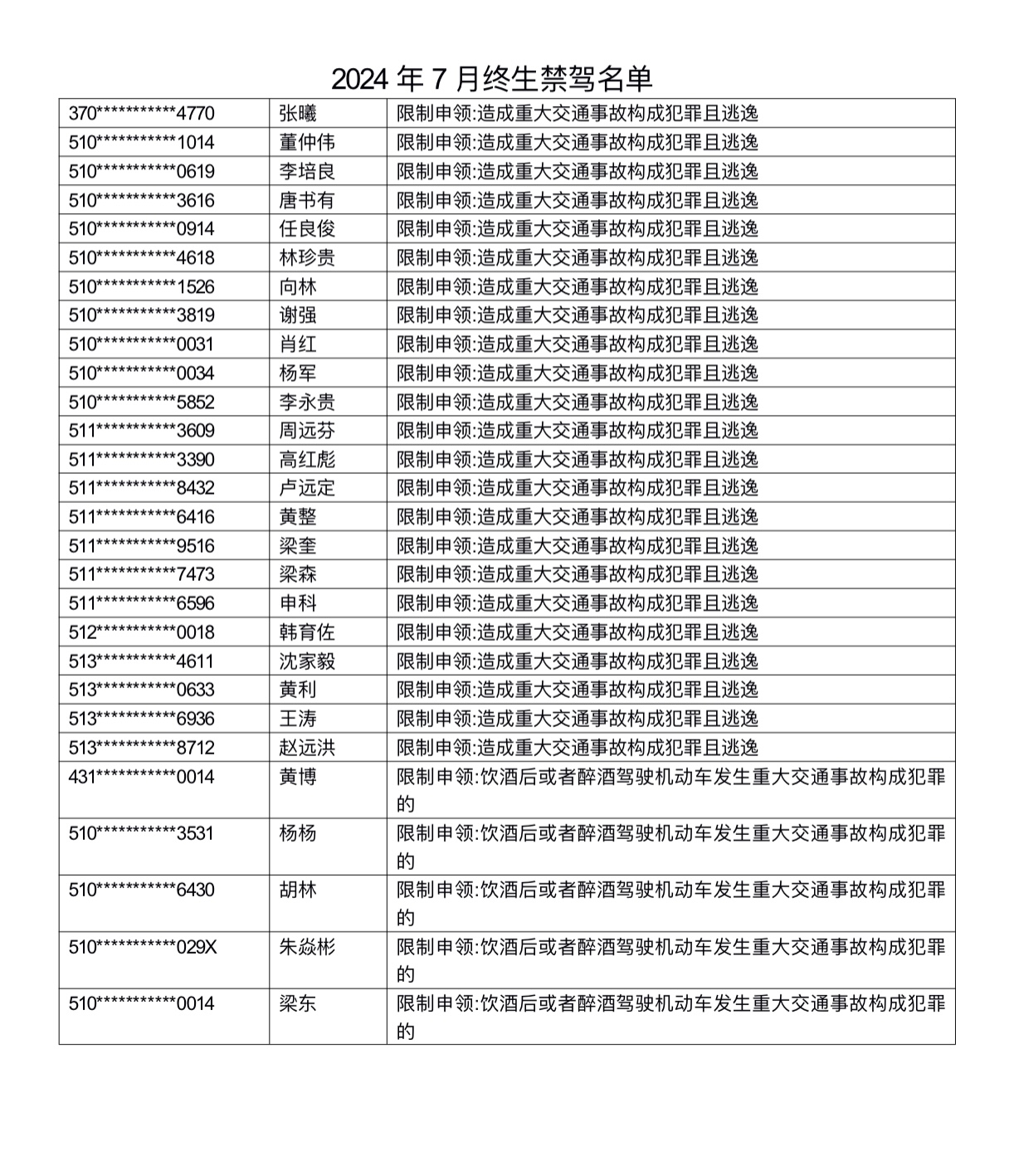 8月27日,四川省公安厅交警总队向社会集中公布了2024年7月被终生禁驾的58人名单,其中年龄最大的71岁,年龄最小的17岁。