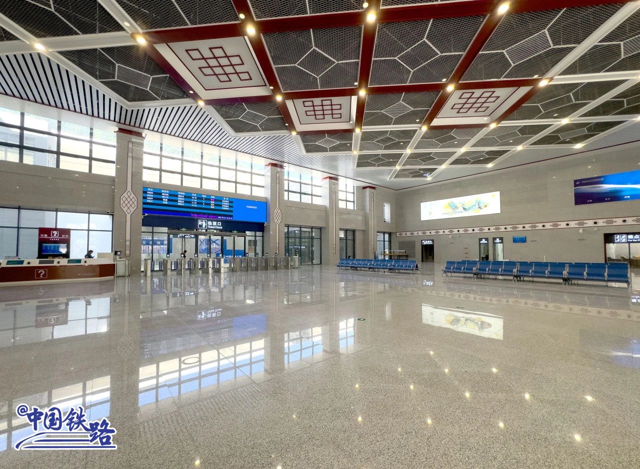 黄龙九寨站的设计灵感主要来自当地的藏族文化。坡屋顶象征远方的雪山走势;站房立面尊重当地建筑传统,融入窗套、檐口等特色造型;配色选择藏族传统的“红、白”两色。此外,站房装饰上还融合岷江之水的文化元素,让站房更显大气沉稳。