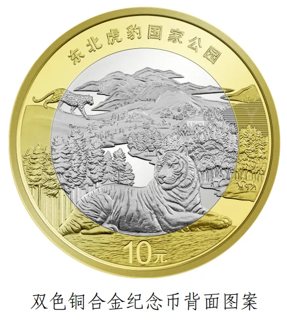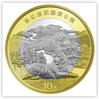 东北虎豹国家公园双色铜合金纪念币背面主景图案为东北虎、东北豹、红松等,辅以老爷岭、珲春河、梅花鹿等,并刊“东北虎豹国家公园”字样及面额“10元”字样。