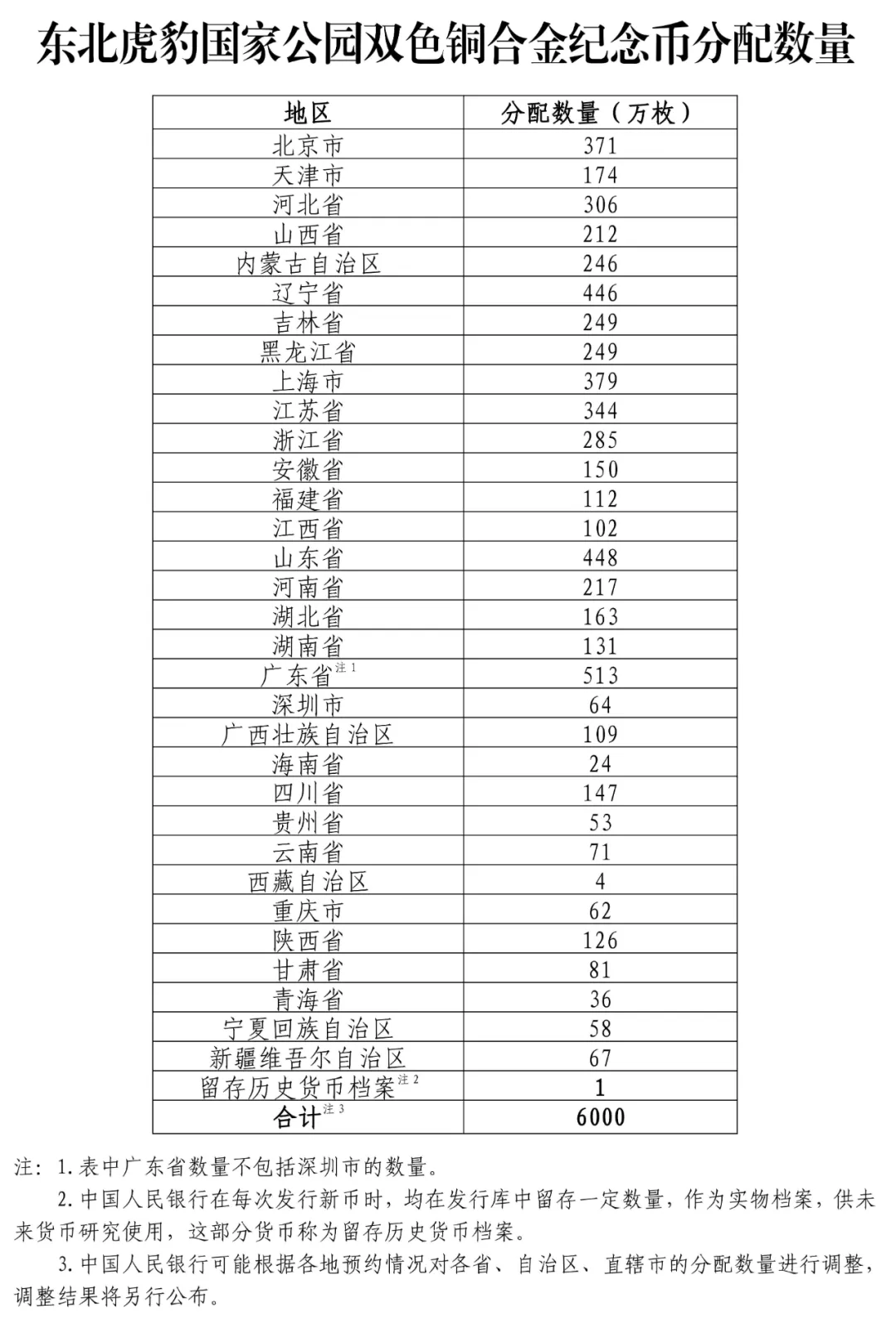 东北虎豹国家公园双色铜合金纪念币面额为10元,直径27毫米,材质为双色铜合金,发行数量为6000万枚。各省、自治区、直辖市分配数量如下: