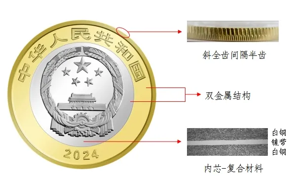 硬币外环为黄铜合金,内芯为具有独特机读性能的镍带复合白铜材料。内芯复合材料防伪特征效果如下: