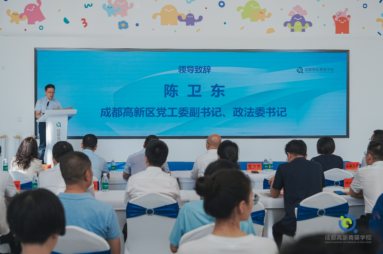成都高新区党工委副书记、政法委书记陈卫东发表致辞并对即将开启青葵之旅的学生们送上美好祝福,他说:“特殊教育,是家长关心、社会关注、政府关切的民生大事。办好特殊教育,是新时期教育优质均衡发展的重要体现,是建设高质量教育体系的重要内容。成都高新区始终秉持‘有教无类,因材施教’的教育理念,致力于建设老百姓家门口的好学校,此次青葵学校由成都高新区教育文化体育局与成都大学合作举办,实现了双方特殊教育资源的优化配置与共建共享,是对成都高新区特殊教育硬件设施的进一步完善,更是对特殊教育教育理念、教学方法、师资力量的全面升级。”同时,他也呼吁社会各界继续给予特殊教育更多的关注与支持,共同为这群孩子们撑起一片蓝天,让他们在爱的阳光下茁壮成长,让每一个生命都能绽放出独特的光彩。