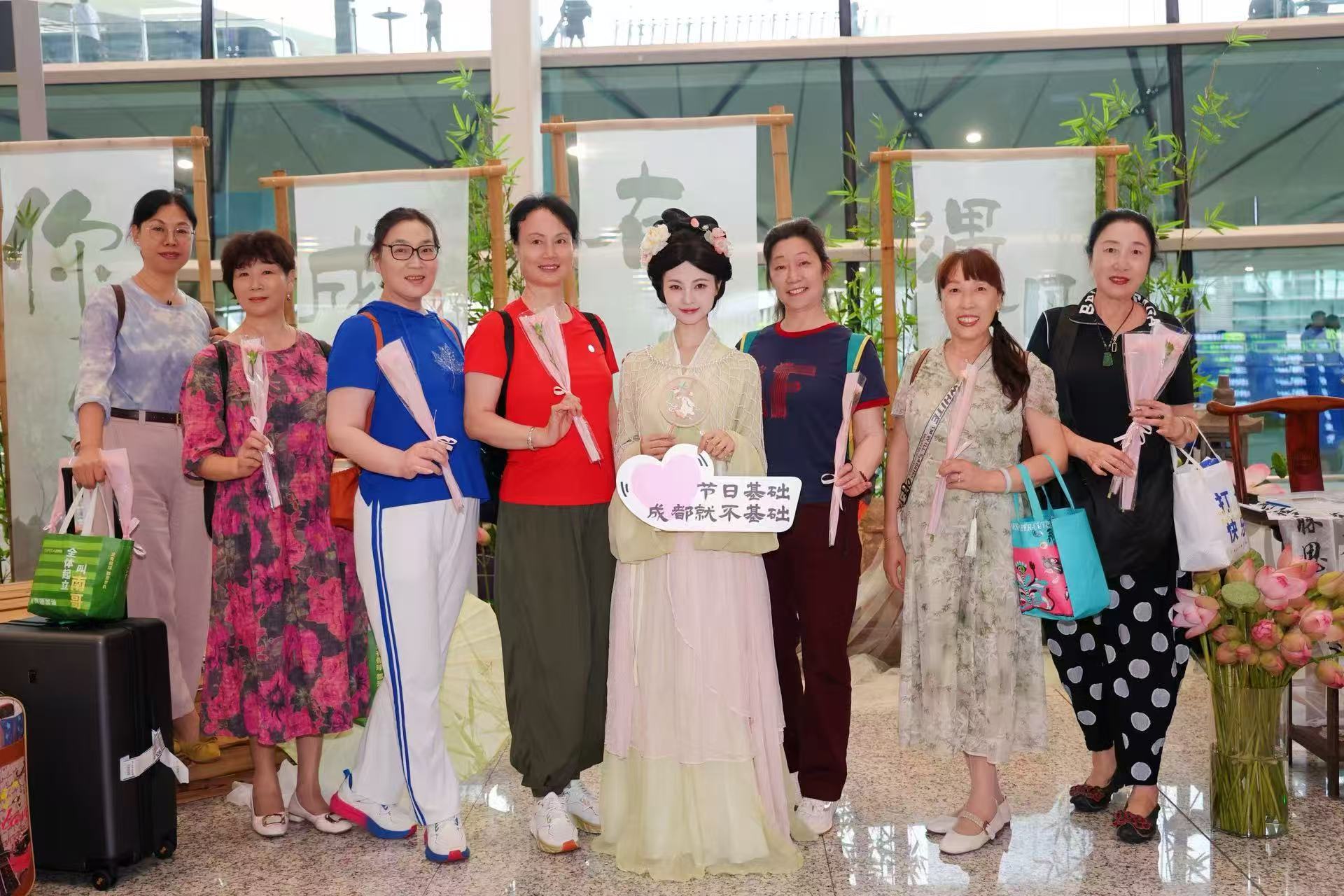 而“七仙女空降”的创意设计,更是为活动注入灵动仙气──8名身着精致汉服的工作人员化身“七仙女”与“牛郎”,从机场行李传送带依次亮相,手持熊猫玩偶、川剧变脸木偶、盖碗茶等成都特色元素,引发旅客围观打卡。同时,“七仙女”与旅客共赴“七夕诗句之约”,并让旅客在趣味体验中触摸成都烟火气。