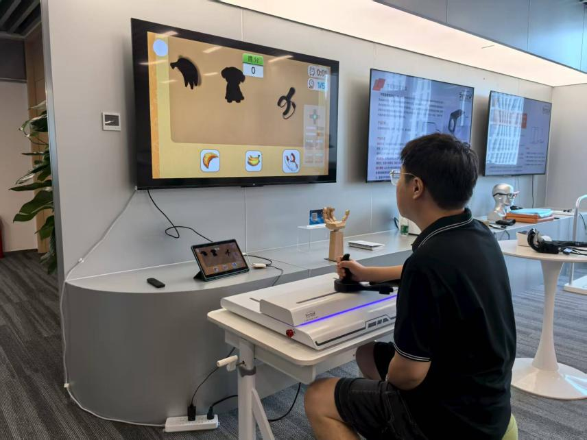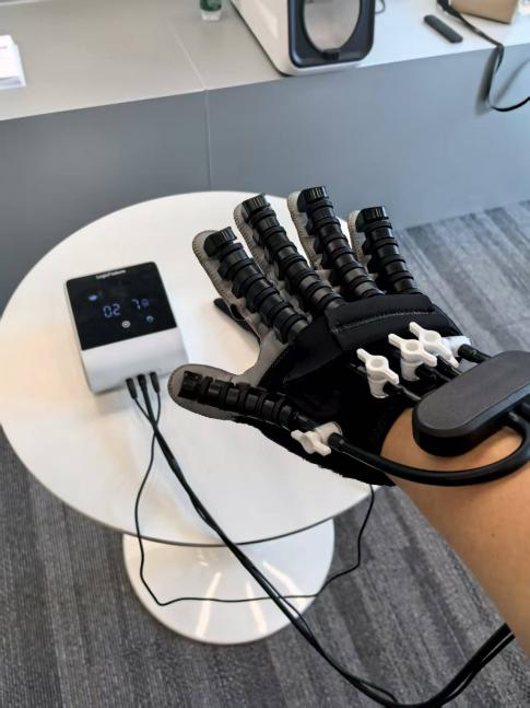技术突破仍在加速。在研究院的演示厅,张泰略给记者戴上手套,这款“手部康复训练机器人”也沿用了“游戏”逻辑,由动力手套、主机、镜像手套三部分组成,通过机械辅助来增加康复患者关节活动度和缓解肌张力。
