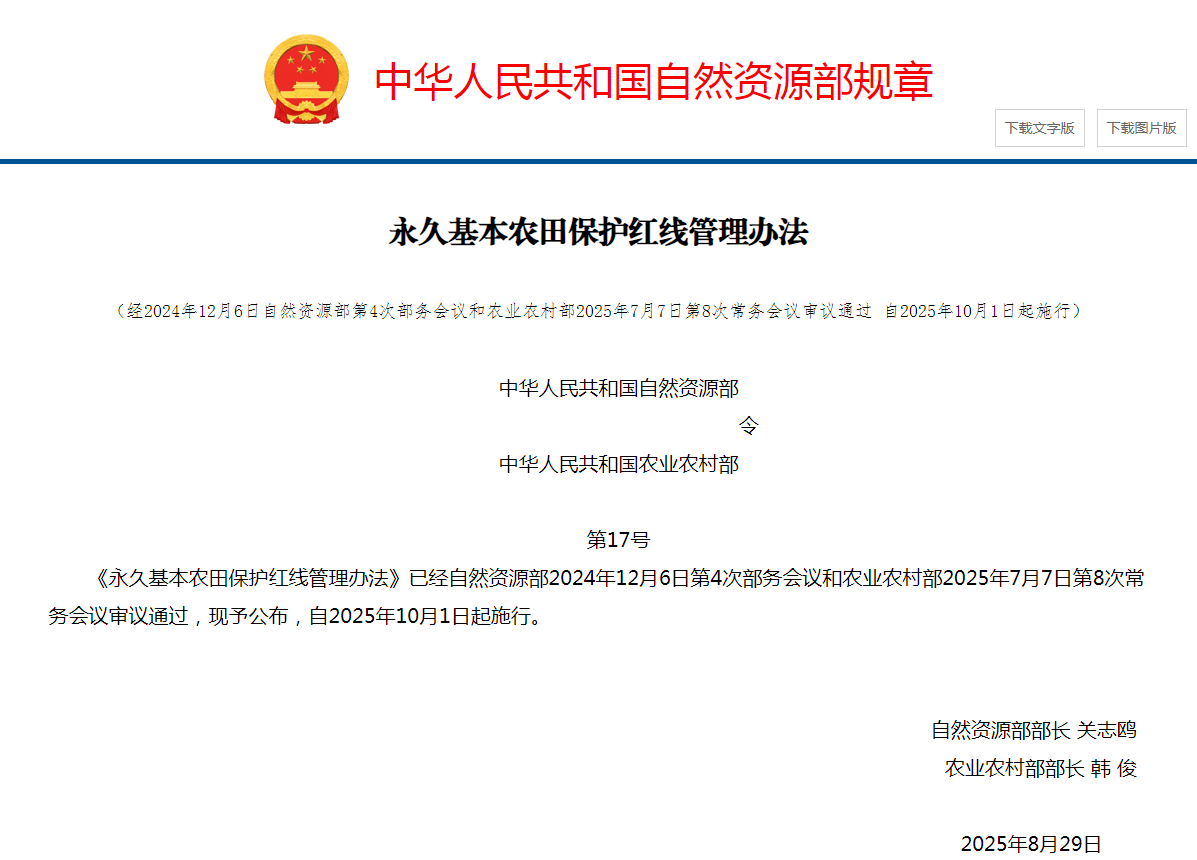 《永久基本农田保护红线管理办法》已经自然资源部2024年12月6日第4次部务会议和农业农村部2025年7月7日第8次常务会议审议通过,现予公布,自2025年10月1日起施行。