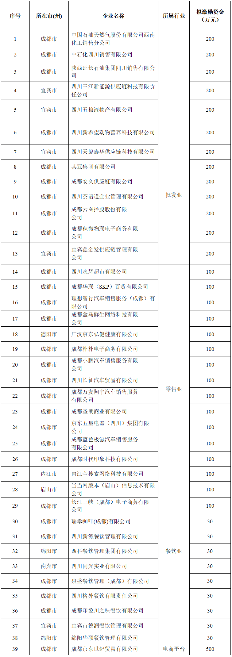 四川发布客户端消息 日前,四川省商务厅公示省政府“16条”中商贸企业经营增长激励拟支持企业名单,共有39家企业符合激励条件,拟予以支持。公示时间为2025年8月28日—2025年9月1日。