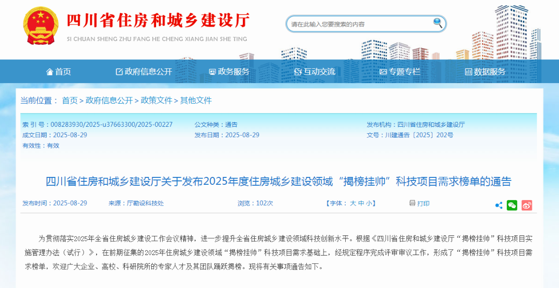 四川发布客户端消息 为进一步提升全省住房城乡建设领域科技创新水平,日前,住房城乡建设厅发布2025年度住房城乡建设领域“揭榜挂帅”科技项目需求榜单,欢迎广大企业、高校科研院所的专家人才及其团队踊跃揭榜。