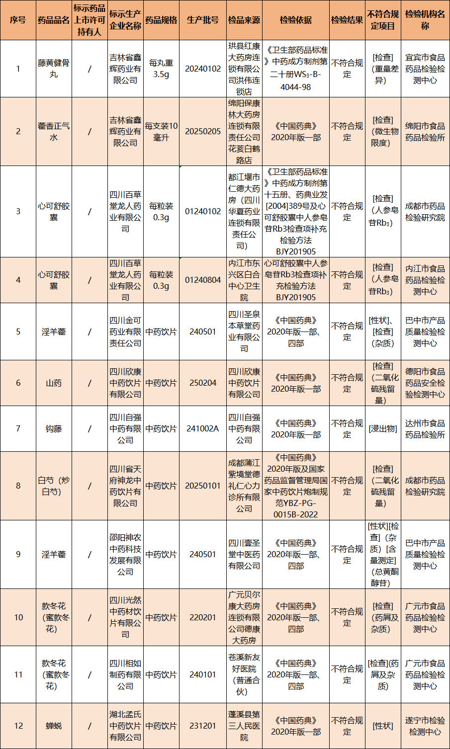四川发布客户端消息 日前,四川省药品监督管理局发布通告,经宜宾市食品药品检验检测中心等9家药品检验机构检验,标示为吉林省鑫辉药业有限公司等10家药品生产企业生产的12批次药品不符合规定。