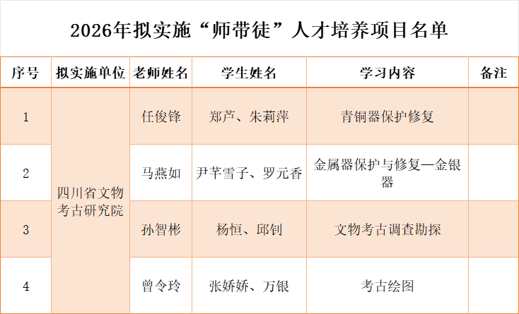日前,四川省文物局公示2026年拟实施“师带徒”人才培养项目名单,公示期为2025年9月1日至9月5日。