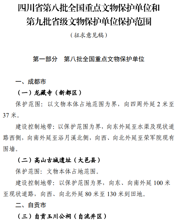 四川发布客户端消息 为有效保障文物安全,加强周边环境管控力度,近日,四川省文物局发布公告,公开征求《关于公布四川省第八批全国重点文物保护单位和第九批省级文物保护单位保护范围(征求意见稿)》意见,公开征求意见时间:2025年8月29日至9月5日。