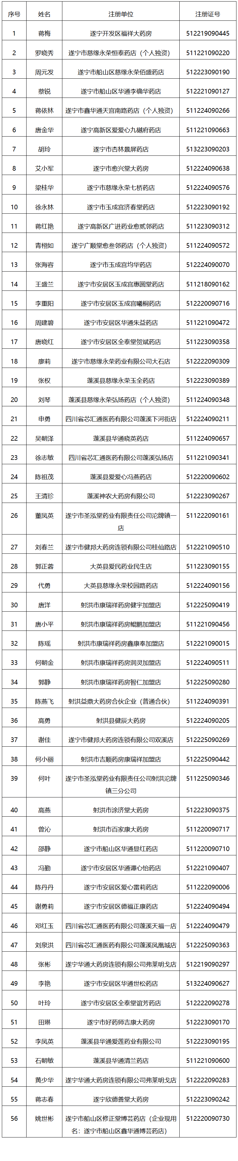 四川发布客户端消息 日前,四川省药品监督管理局发布公告,经查,蒋梅等56人存在《执业药师注册证》挂靠行为。根据《执业药师注册管理办法》第三十四条规定,四川省药品监督管理局现对蒋梅等56人的《执业药师注册证》予以撤销,三年内不予注册,并将不良信息录入全国执业药师注册管理信息系统。