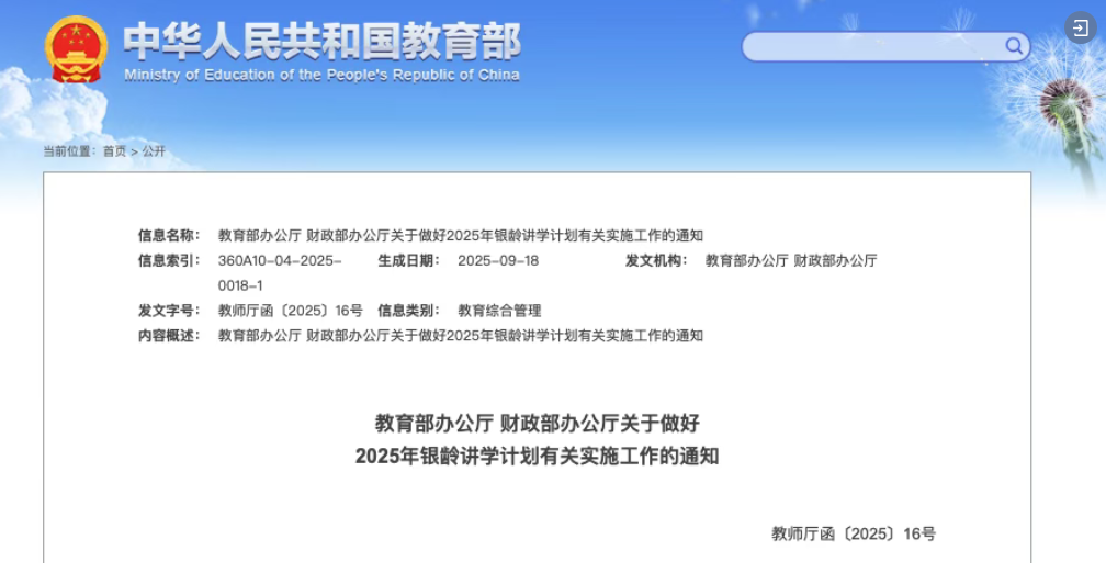 日前,教育部、财政部联合印发《关于做好2025年银龄讲学计划有关实施工作的通知》。根据国家银龄教师行动计划整体部署,今年计划招募7000名银龄讲学教师,发挥优秀退休教师引领示范作用,帮助提升农村学校教学水平和育人管理能力,推动城乡教育优质均衡发展。四川今年将招募370名退休教师。
