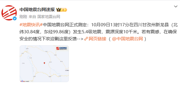 中国地震台网正式测定:10月09日13时17分在四川甘孜州新龙县(北纬30.84度,东经99.86度)发生5.4级地震,震源深度10千米。