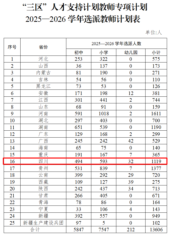《通知》指出,2025—2026学年全国计划选派13606名教师,其中初中计划选派5847名,小学计划选派7547名,幼儿园计划选派212名。选派教师主要由各省(区、市)和新疆生产建设兵团在本行政区域范围内调配,调动省会城市、中心城市、非受援县的优质教师资源支持省内受援县。实施范围继续聚焦脱贫地区(原国家确定的连片特困地区、国家扶贫开发工作重点县、省级扶贫开发工作重点县及各地确定的其他深度贫困地区、新疆生产建设兵团困难团场),重点向国家乡村振兴重点帮扶县、“三区三州”等地区倾斜。